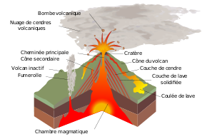 - Une ou plusieurs cheminées volcaniques secondaires partant de la chambre magmatique ou de la cheminée volcanique principale et débouchant sur les flancs du volcan.