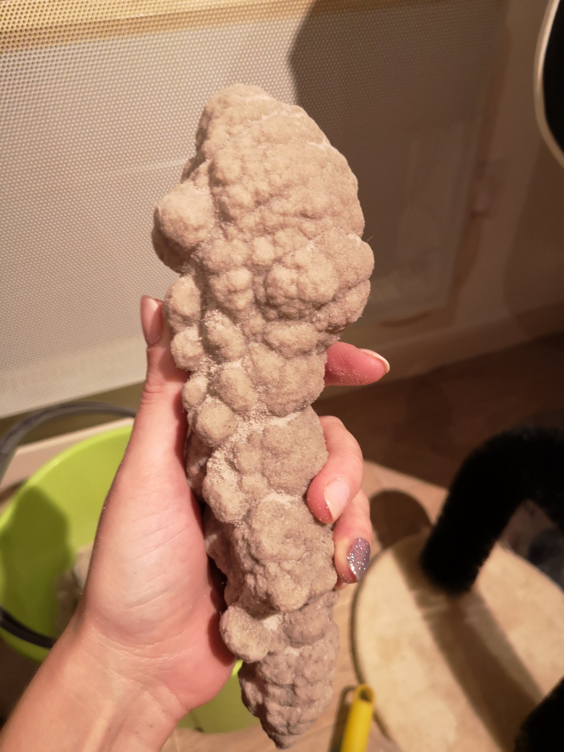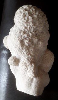 Ces calcites sont appelées “Bellecroix” ou encore “calcite sableuse”. Les cristaux sont regroupés en deux amas accolés. On reconnait la forme des cristaux de calcite, mais la roche est faite de grès.