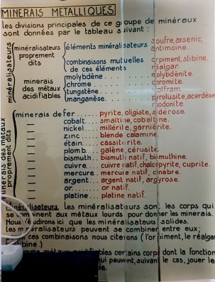 Dans un minéral, le métal est présent sous forme d'oxydes ou de sels (sulfate, chlorure, carbonate...) c'est à dire des assemblages variés d'un petit nombre d'éléments : métaux, oxygène, silicium, souffre
